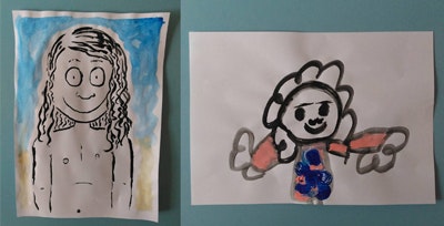 She is better at picking a subject to draw and just going for it. Often we would draw the same thing, like the portrait/self-portrait above, but her pictures are always more joyful and fun.